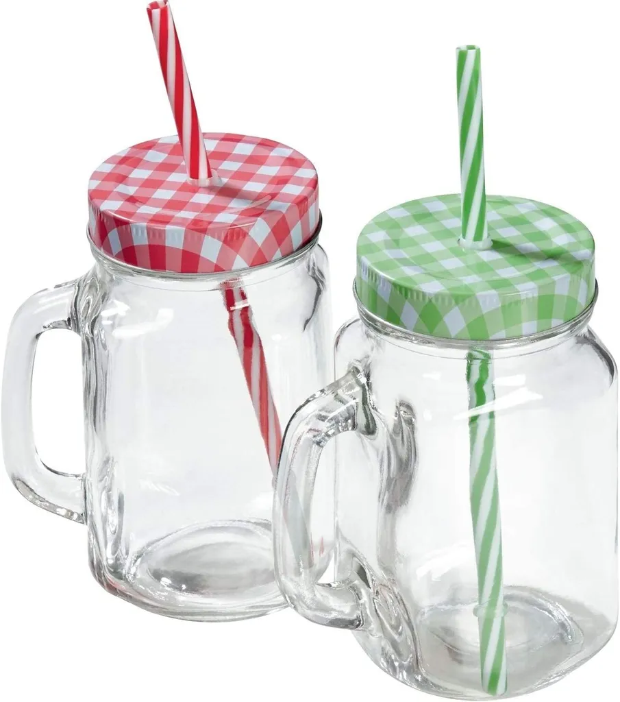 2 Gläser Mit Deckel, Griff Und Strohhalm, Trinkhalm Einmachgläser