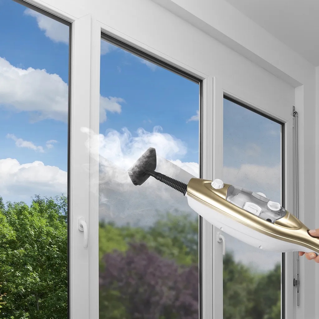 CLEANmaxx Dampfbesen – Mit Knickgelenk – Gold/weiß Dampfreiniger Steam Hygiene Fliesen Küche Bad Reinigung