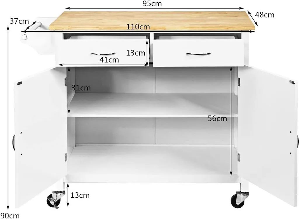 COSTWAY Rollende Kücheninsel Aus Gummiholz, Küchenwagen Mit Handtuchhalter & Verstellbarem Regal & Schubladen, Servierwagen Mit Arbeitsplatte Für Küche, Esszimmer & Bar (Weiß)