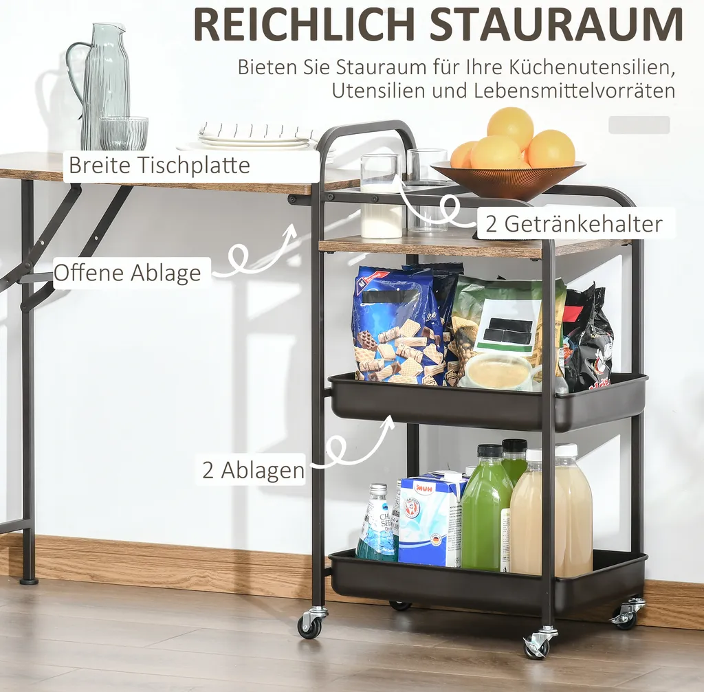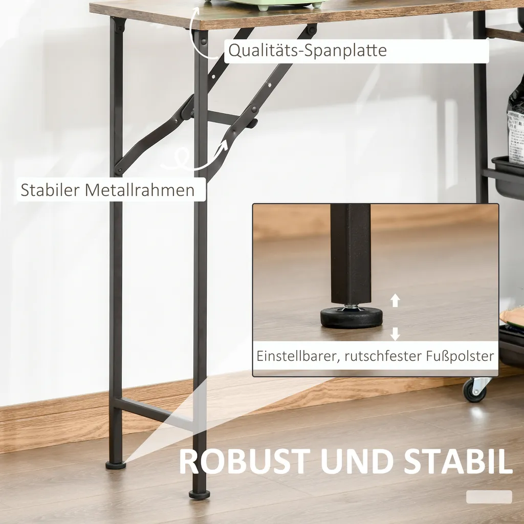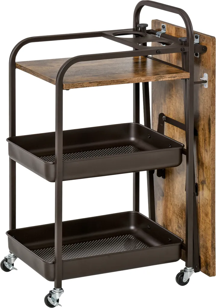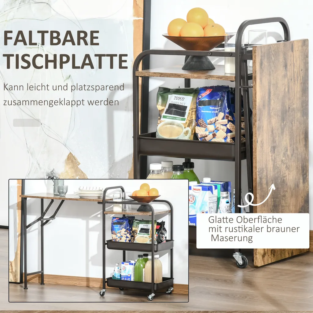 HOMCOM Küchenwagen Küchenrollwagen Servierwagen Mit 1 Klappbaren Tischplatte 2 Tabletts Und 1 Offenes Regal Rollen Verstellbare Fußpolster E1-Spanplatte Metall Rustikal-Braun 118 X 36,5 X 82 Cm