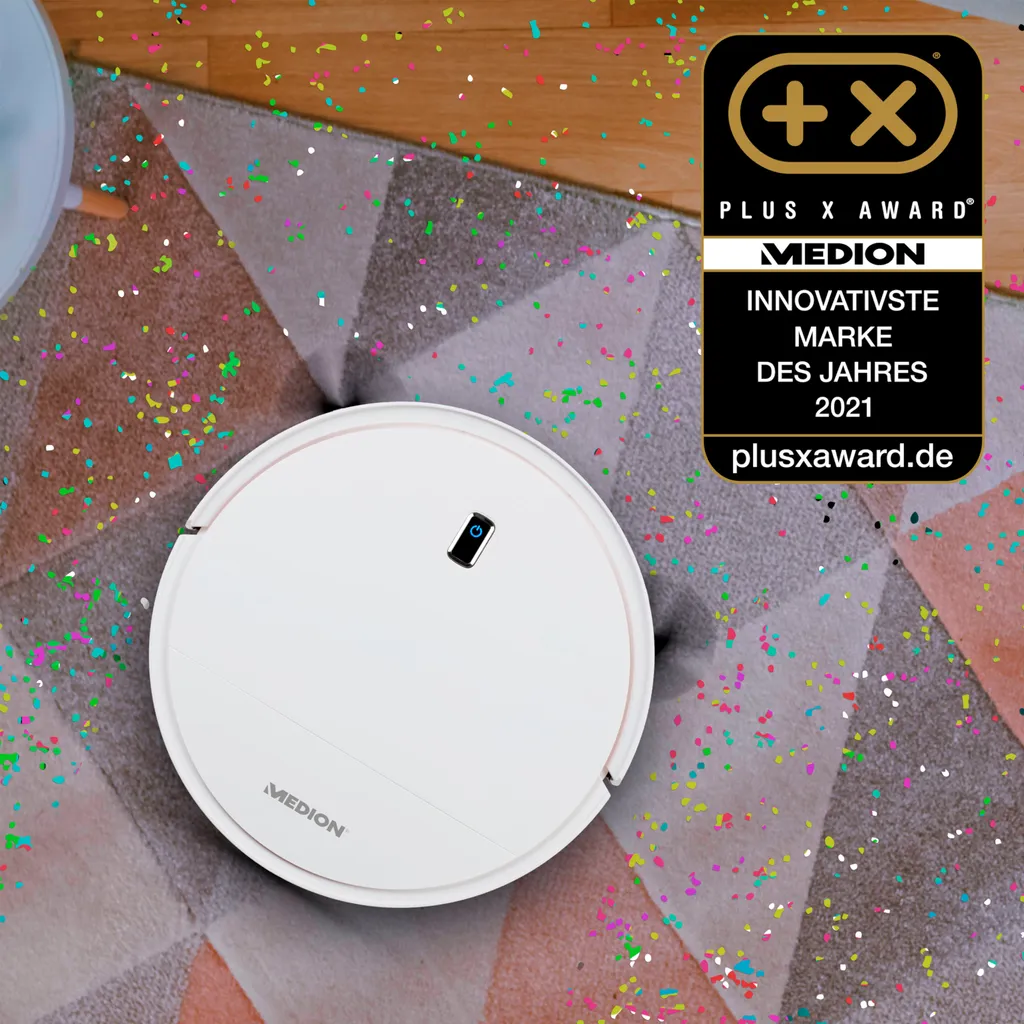MEDION Staubsaugerroboter Mit Ladestation E40 (Staubsaugerroboter Für Hartböden, Fliesen, Laminat, Optimiert Für Tierhaare, Direkte Absaugung, Automatische Rückkehr Zur Ladestation)