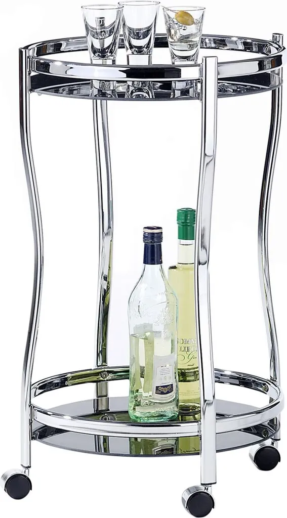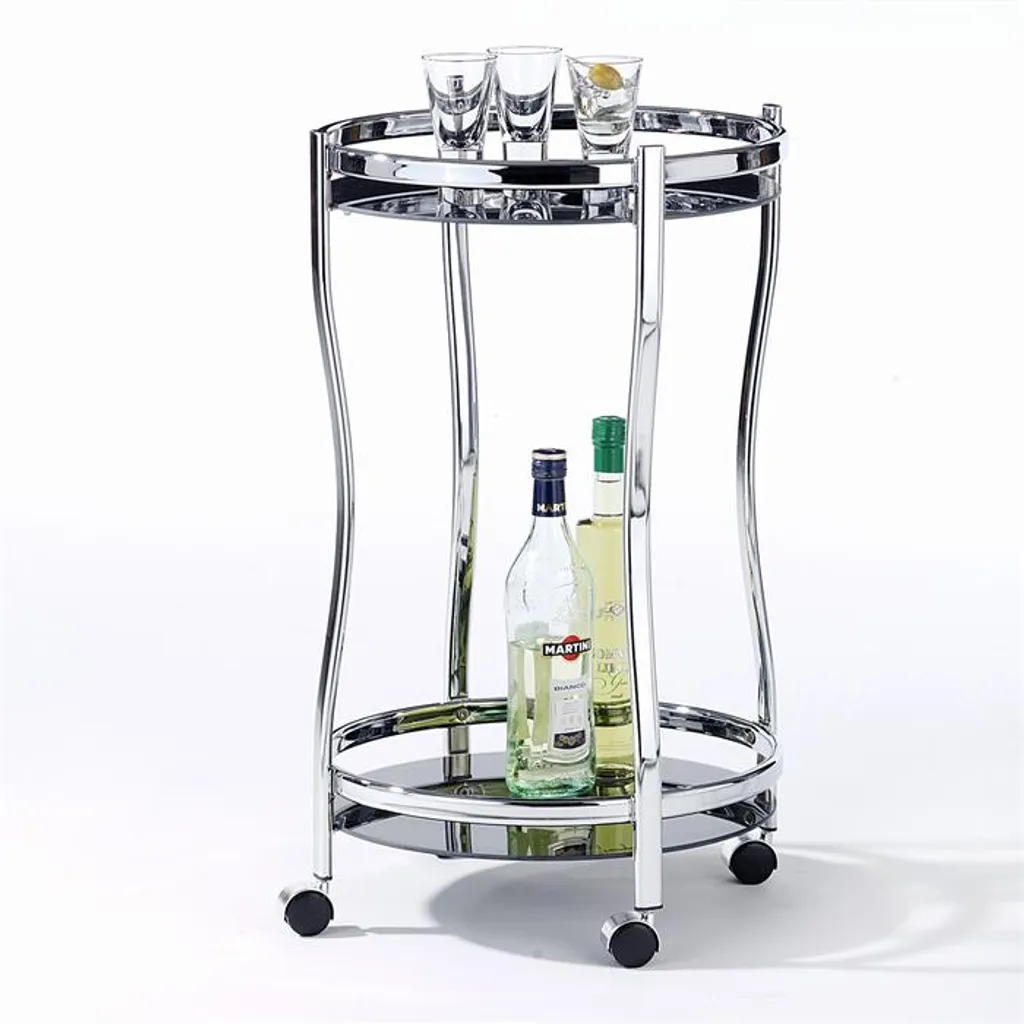 Servierwagen, Schöner Beistellwagen Rund, Praktischer Servicewagen 2 Sicherheitsglasböden In Schwarz, Eleganter Teewagen Mit Metallgestell Verchromt